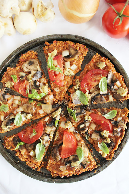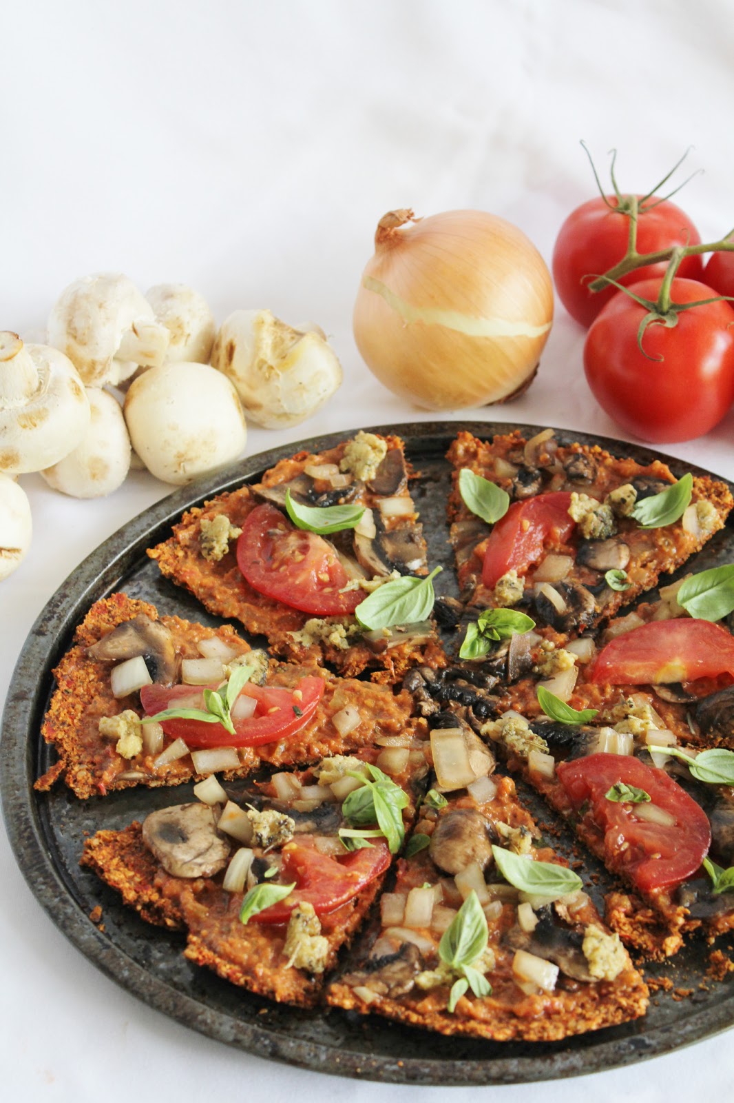 pizza with red pepper flax crust, sun-dried tomato sauce, pine nut cheese & veggies