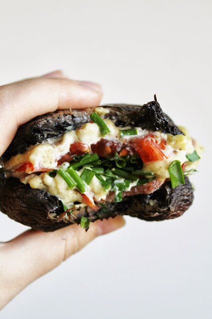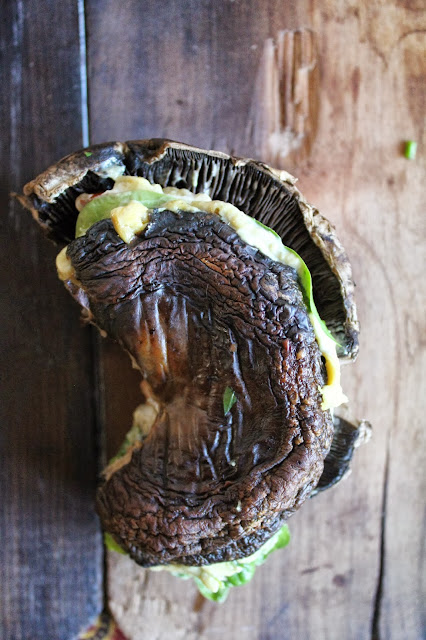 My mom bought portobello mushrooms and organic spinach from the farmers market on the weekend so I wanted to make a recipe with them for you guys. Eat local! Yeah, baby! I initially planned on making portobello "steaks" with spinach pesto and cashew cheese but wound up not making pesto (instead simply serving the mushrooms with crisp spinach leaves) and calling them burgers because I stacked 'em like sandwiches. What up, simplicity.