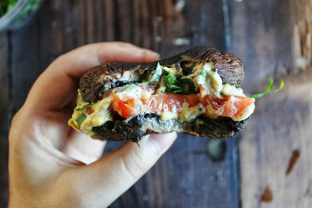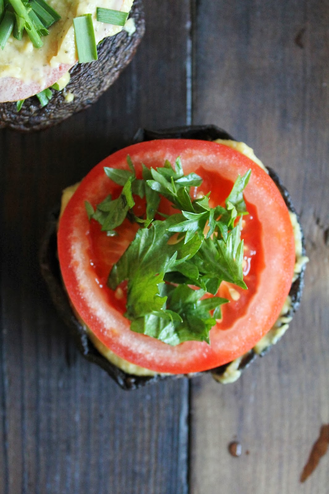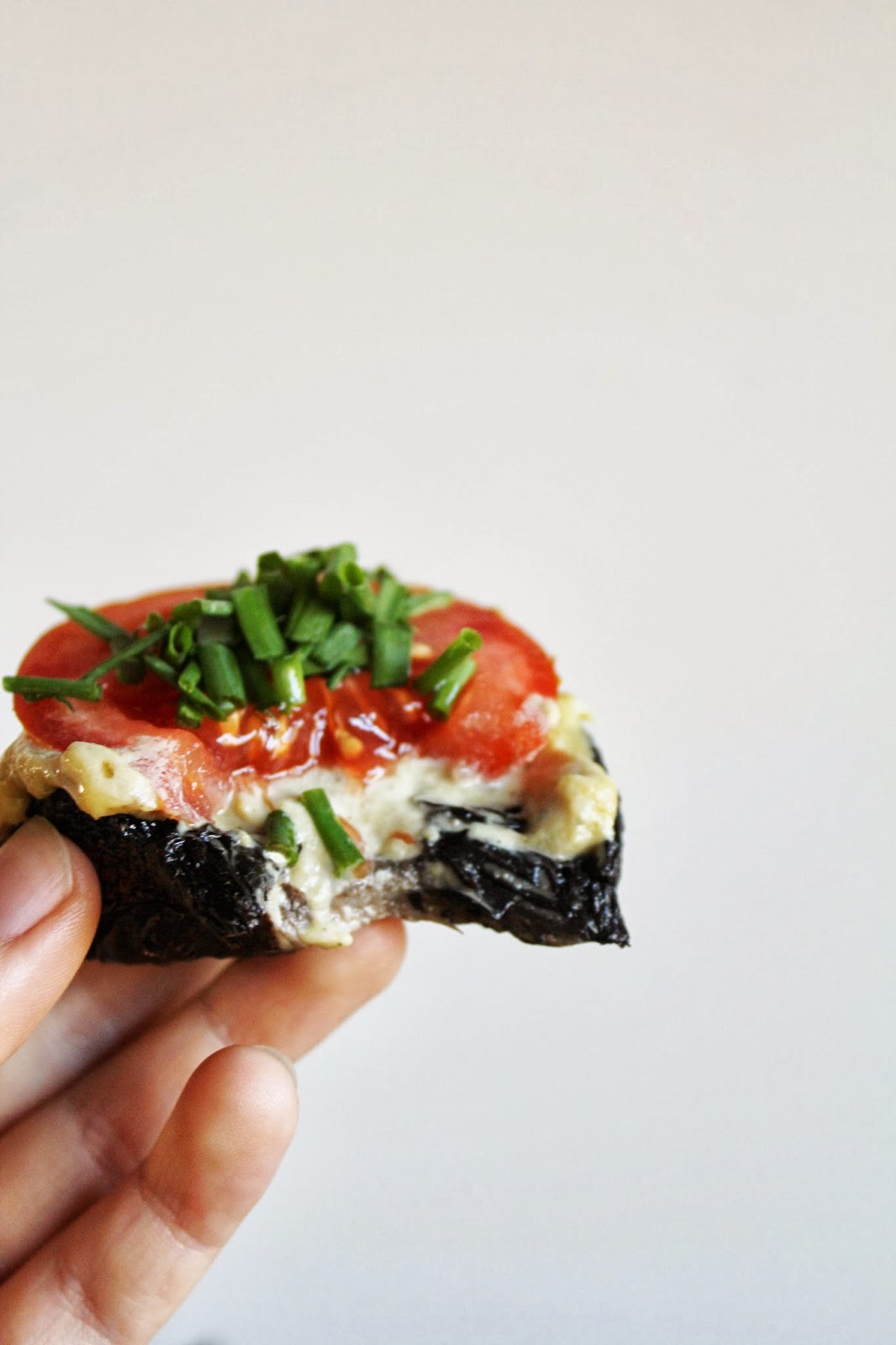 When everything is ready, spread your cheese onto your mushrooms and layer with herbs and tomatoes. You can double-shroom it (that is now a term) if you want, and/or use fresh mushrooms instead of marinated. Note: you're gonna have lots of left over cashew cheese. Let it sit in a quiet spot overnight then put in the fridge and eat within a week.